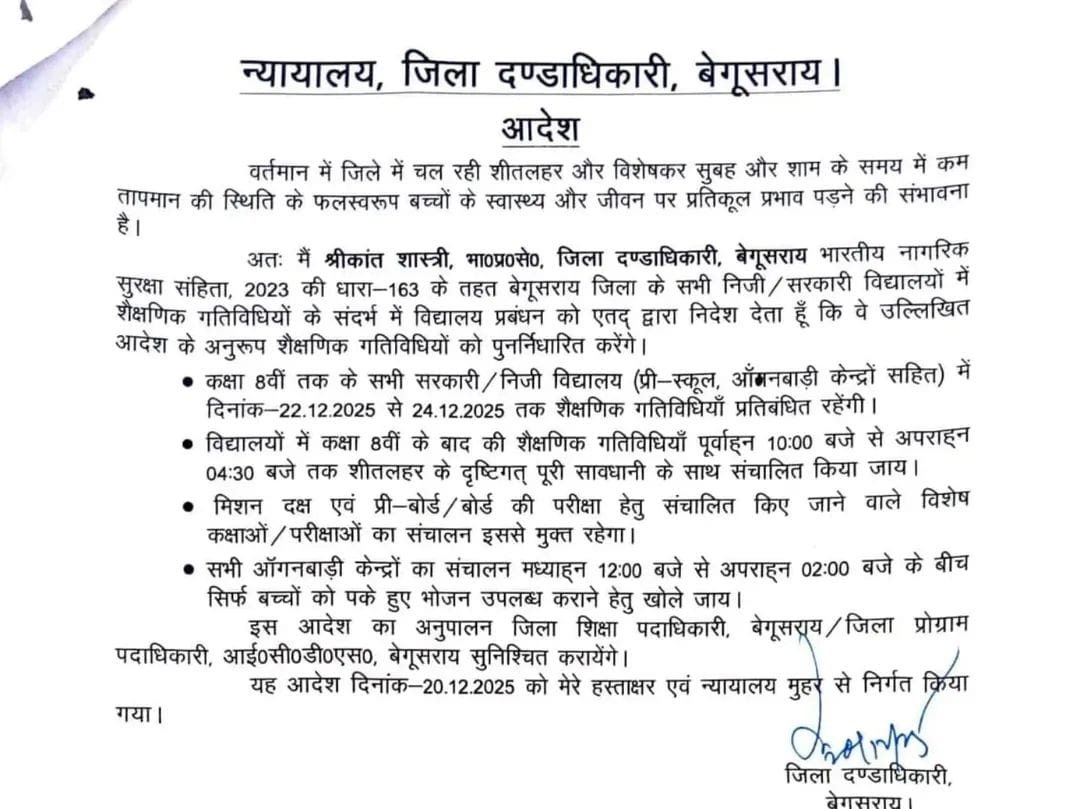 Begusarai News : बेगूसराय में जारी शीतलहर और विशेष रूप से सुबह एवं शाम के समय तापमान में हो रही अत्यधिक गिरावट को देखते हुए जिला प्रशासन ने बच्चों के स्वास्थ्य और जीवन की सुरक्षा के मद्देनज़र अहम फैसला लिया है।