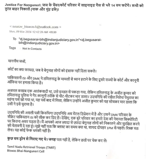 धमकी भरे ई-मेल की शुरुआत ‘Justice For Nanguneri’ शब्दों से की गई है। मेल में लिखने वाले ने न्यायिक प्रक्रिया पर सवाल उठाते हुए तमिलनाडु के अजीत कुमार की पुलिस हिरासत में कथित मौत का जिक्र किया है और दावा किया है कि वह निर्दोष था। इसके साथ ही तमिलनाडु के कुछ राजनीतिक व्यक्तियों से जुड़े पारिवारिक विवादों और राष्ट्रीय सुरक्षा से संबंधित गोपनीय दस्तावेज लीक होने के भी गंभीर आरोप लगाए गए हैं। ई-मेल भेजने वाले ने अपना नाम सौरव विश्वास बताया है और खुद को ‘विश्वास भाई – नांगुनेरी सेल (TNRT)’ से जुड़ा बताया है।