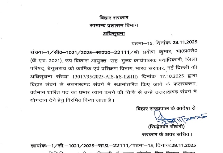 IAS प्रवीण कुमार अब तक बिहार में बेगूसराय जिले में उप विकास आयुक्त (DDC) के रूप में कार्यरत थे। केंद्र सरकार ने 17 अक्टूबर 2025 से प्रभावी आदेश जारी करते हुए उन्हें बिहार कैडर से उत्तराखंड कैडर में स्थानांतरित किया था। इसके अनुपालन में बिहार सरकार ने आज 28 नवंबर से उन्हें आधिकारिक रूप से उत्तराखंड कैडर के लिए विरमित कर दिया है।